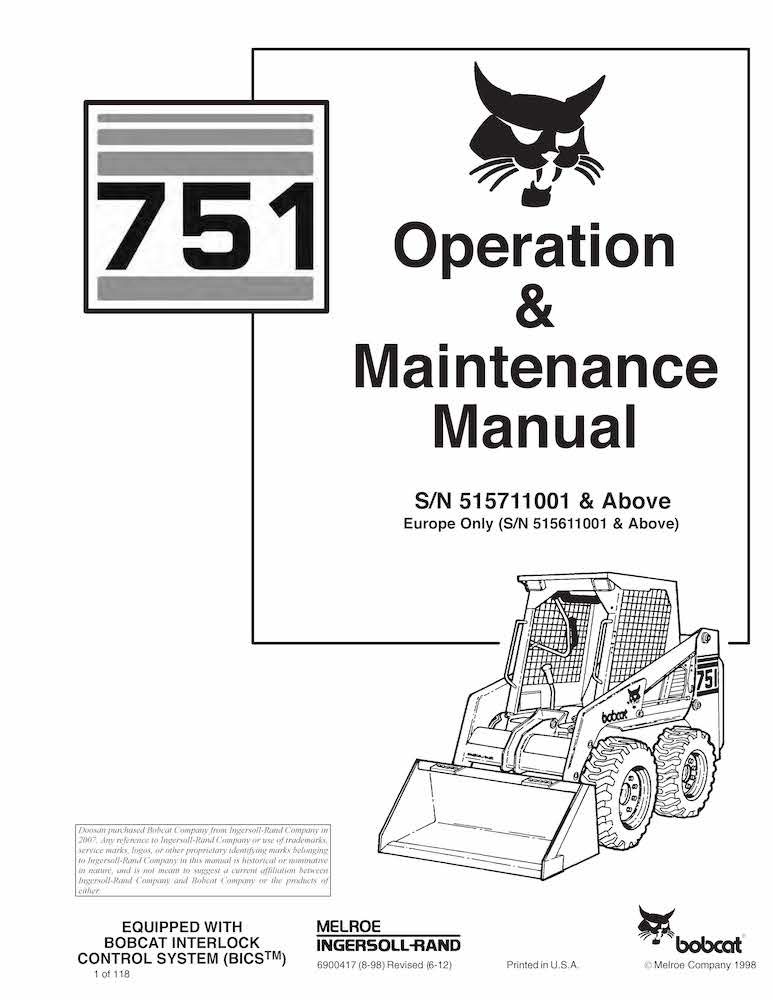 Bobcat 751 skid loader pdf operation & maintenance manual