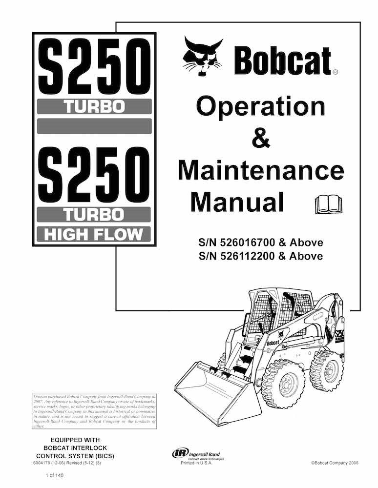 Bobcat S250, S250H skid steer loader pdf operation & maintenance manual