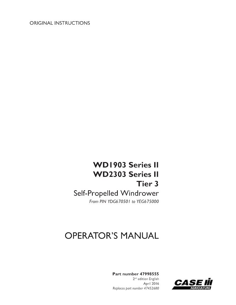 Case WD1903, WD2303 Series II PIN YDG670501 to YEG675000 windrower pdf operator's manual (47998555)