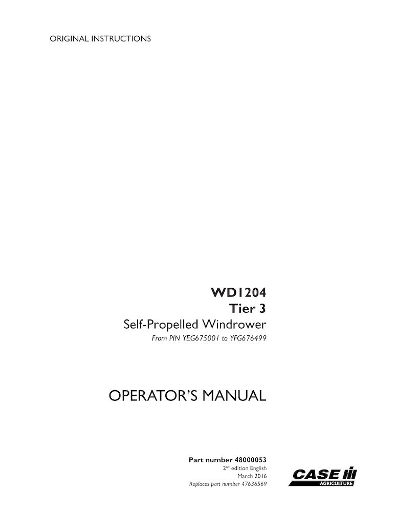 Manual del operador de la segadora hileradora Case WD1204 Tier 3 PIN YEG675001 a YFG676499 (PDF) (48000053)
