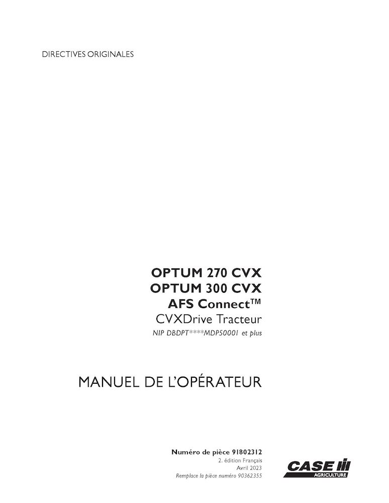 Manual del operador del tractor Case Optum 270 CVX, 300 CVX AFS Connect CVXDrive Tier 4B, PIN DBDPT****MDP50001 (PDF, FR)