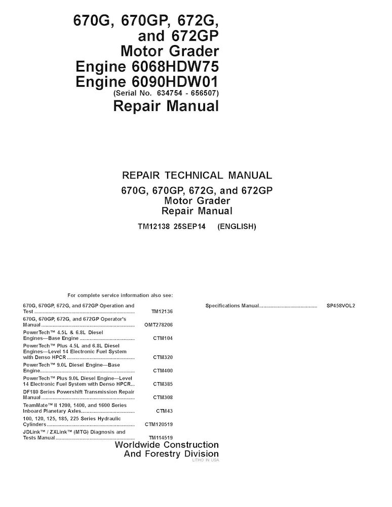 Manual técnico de reparación de motoniveladoras John Deere 670G, 670GP, 672G y 672GP SN 634754-656507 (PDF) (TM12138)