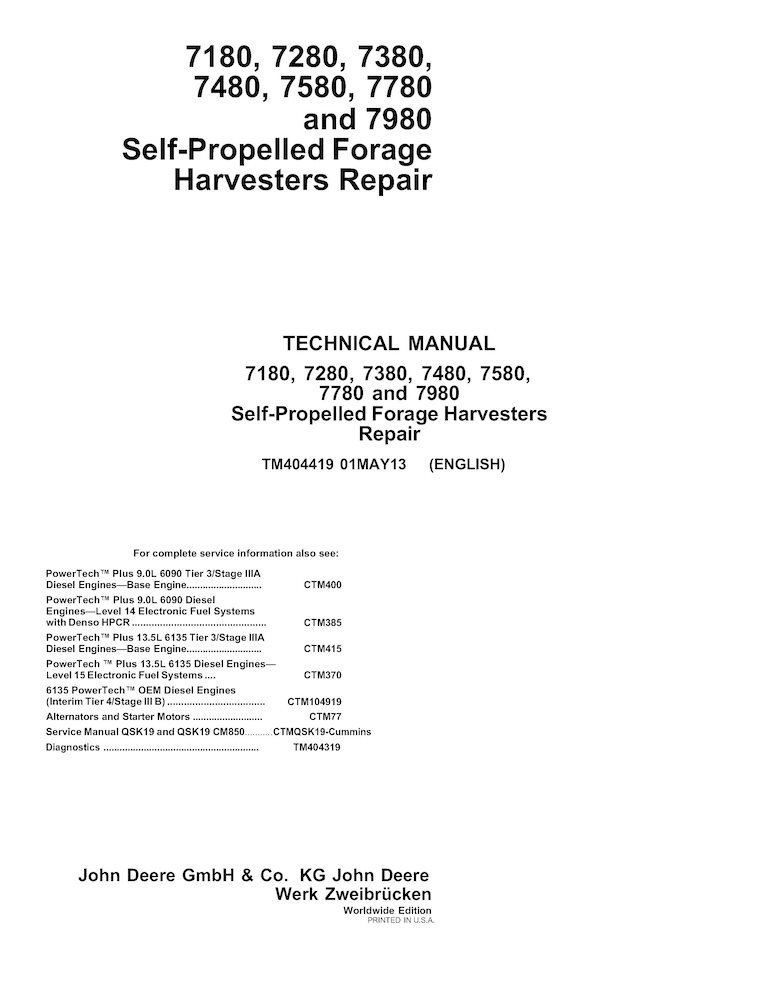Manual técnico de reparación de cosechadoras John Deere 7180, 7280, 7380, 7480, 7580, 7780 y 7980 (PDF, TM404419)