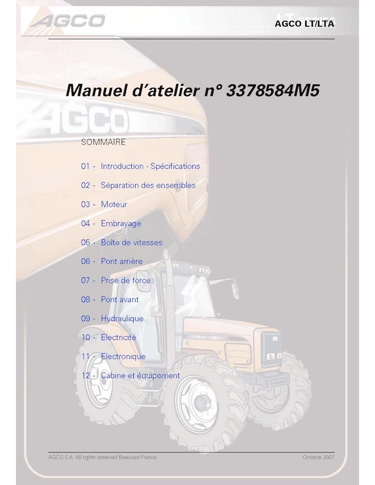 Manuel d'atelier PDF pour tracteurs AGCO LT75, LT90, LT75A, LT85A, LT90A et LT95A (France)