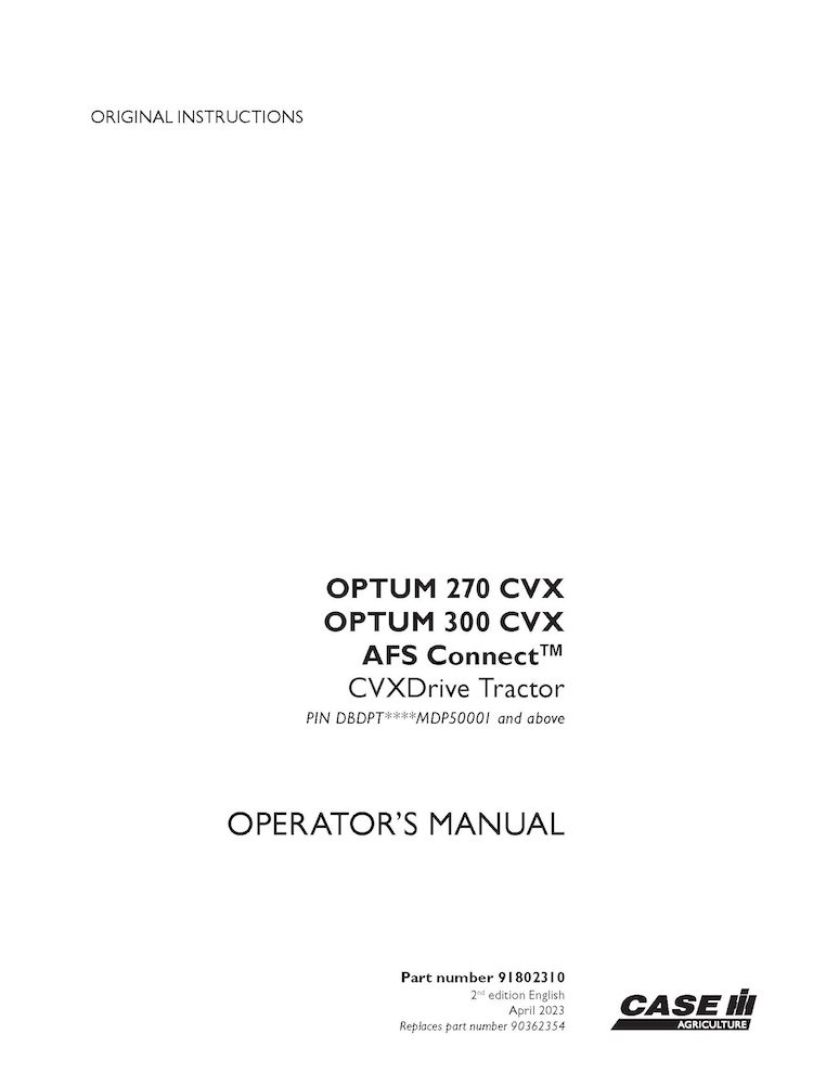 Manuel d'utilisation du tracteur Case Optum 270 CVX, 300 CVX AFS Connect CVXDrive Tier 4B, PIN DBDPT****MDP50001 (91802310)