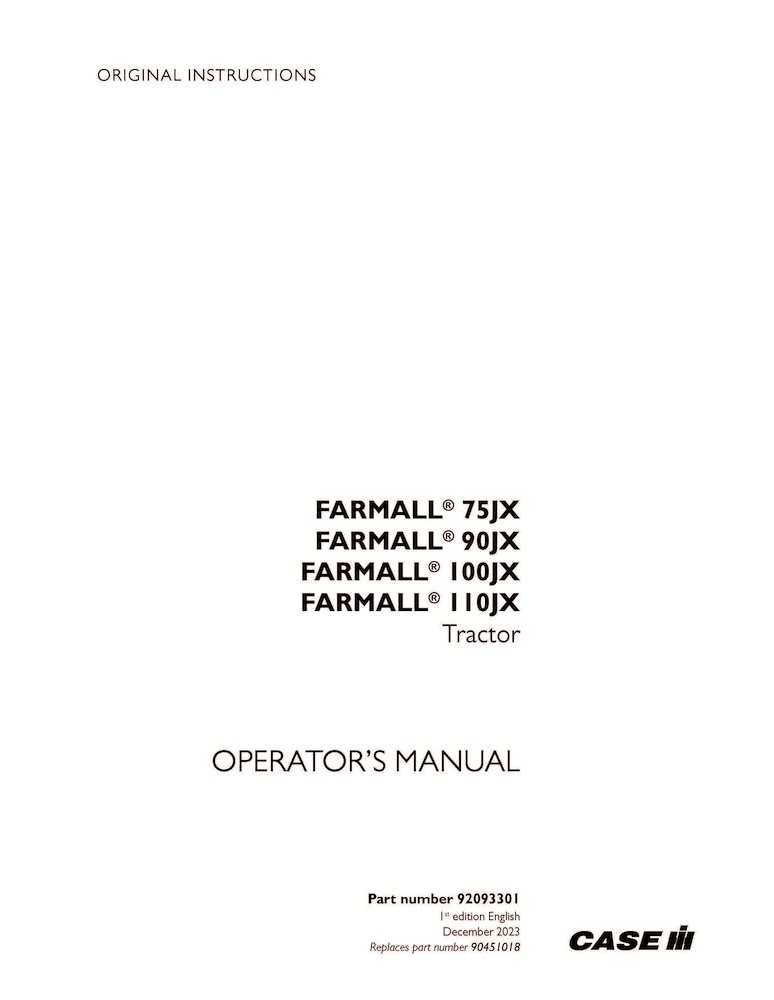Manuel d'utilisation PDF du tracteur Case FARMALL 75JX, 90JX, 100JX, 110JX (92093301)