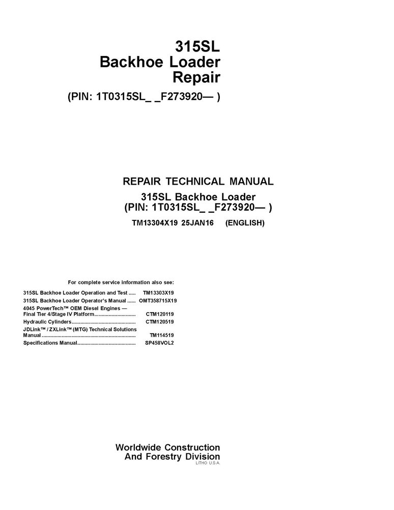 Chargeuse-pelleteuse John Deere 315SL, PIN : 1T0315SL_ _F273920 - Manuel technique de réparation PDF de la chargeuse-pelleteuse