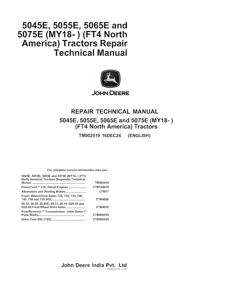Manuel technique de réparation PDF pour tracteurs John Deere 5045E, 5065E, 5055E, 5075E (années-modèles 2018 à 2022) (TM902519)