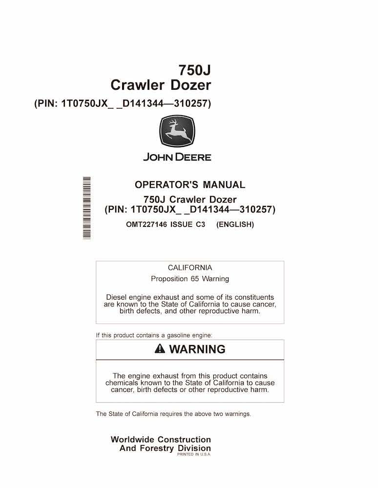 John Deere 750J (SN 141344-310257) crawler dozer pdf operator's manual