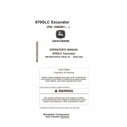 John Deere 870GLC (PIN D000001-) excavator pdf operator's manual