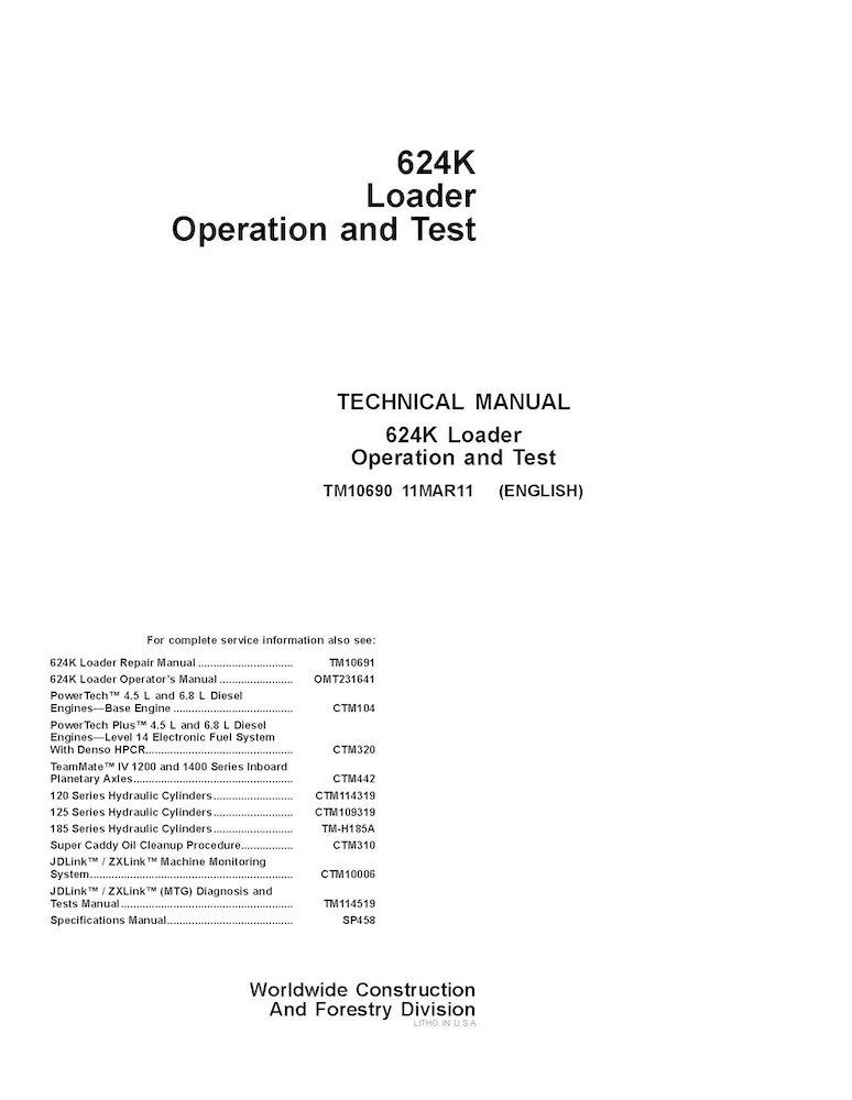 John Deere 624K wheel loader pdf operation and test technical manual (TM10690)