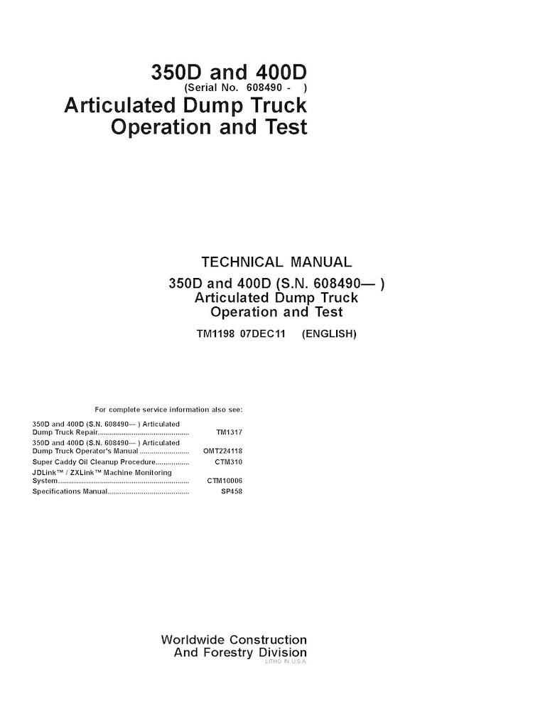 John Deere 350D and 400D SN 608490- articulated truck pdf operation and test technical manual (TM1198)