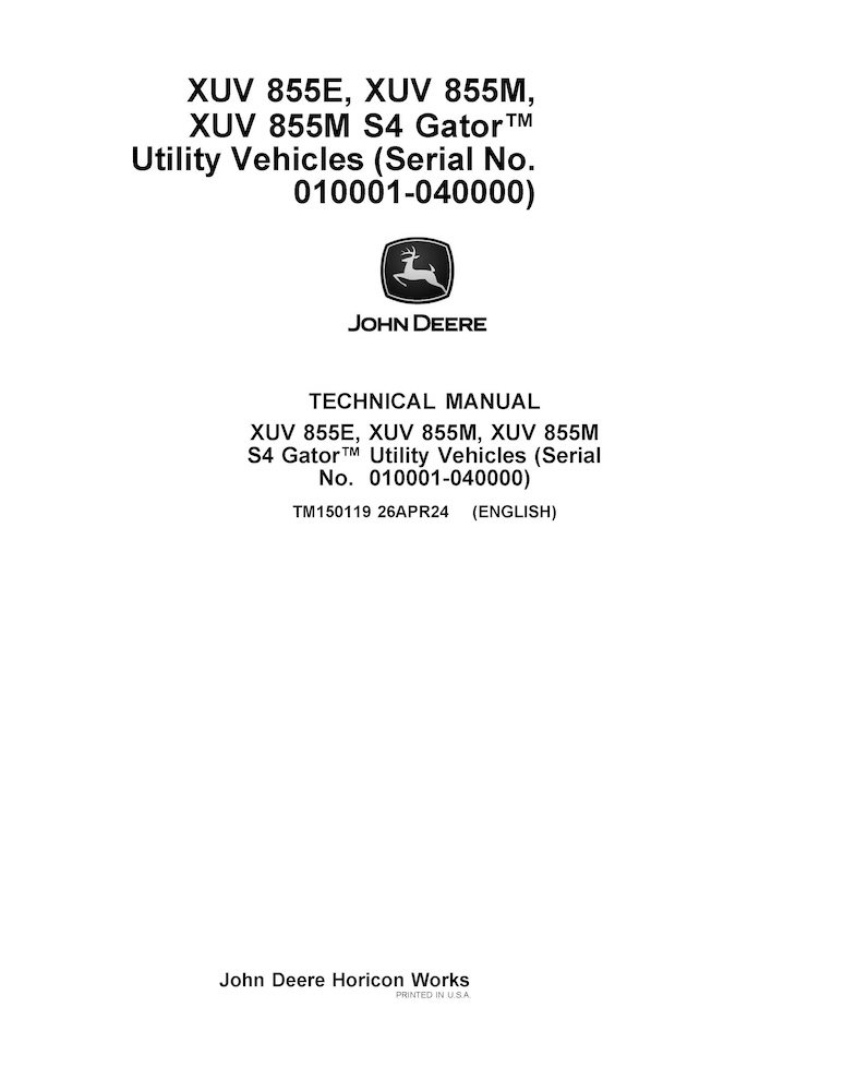 John Deere XUV 855E, XUV 855M, XUV 855M S4 Gator utility vehicle pdf technical manual (TM150119)