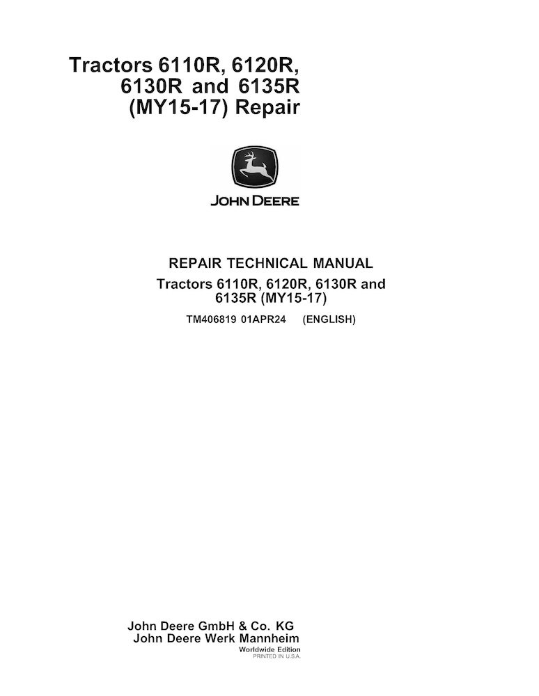 John Deere 6110R, 6120R, 6130R and 6135R (MY15-17) tractor pdf repair technical manual (TM406819)