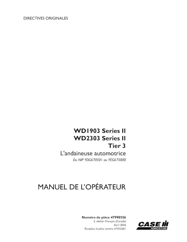 Manual do operador da enfardadeira Case WD1903, WD2303 Série II PIN YDG670501 a YEG675000 pdf FR (47998556)