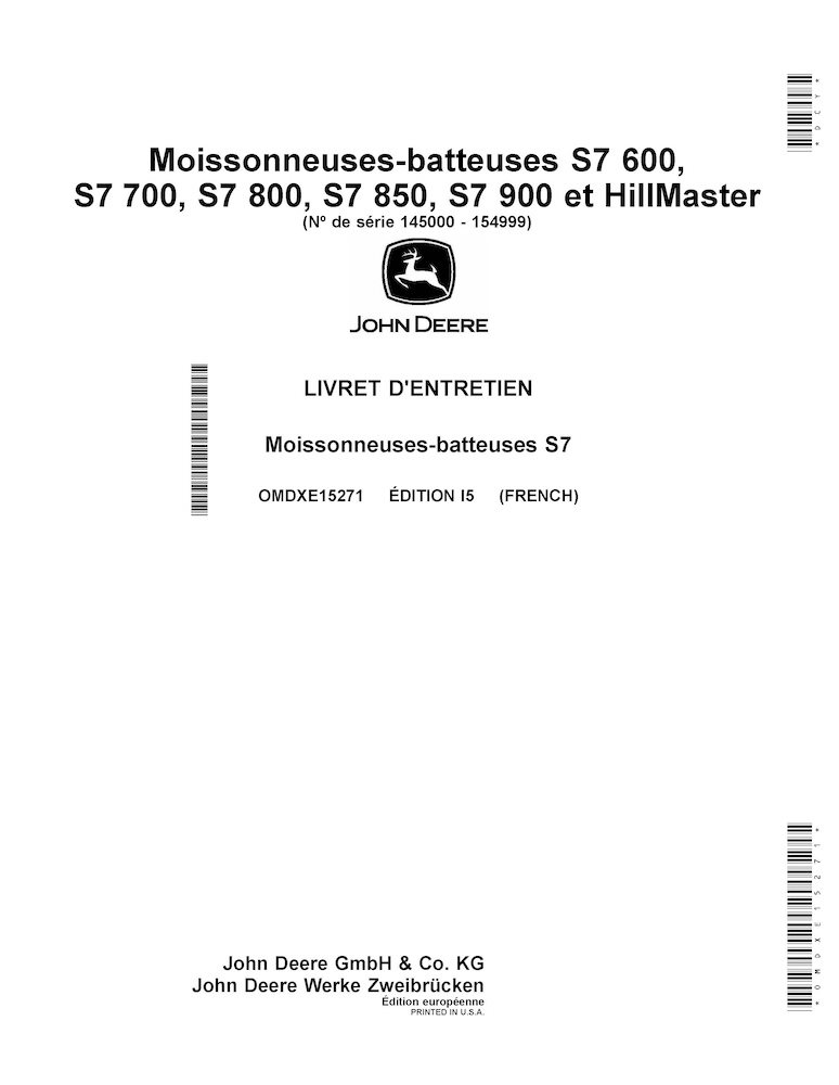 Manual do operador da colheitadeira John Deere S7 600, S7 700, S7 800, S7 850, S7 900 em PDF FR (OMDXE15271)