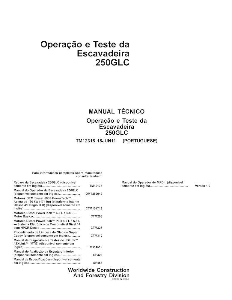 Manual técnico de operação e teste da escavadeira John Deere 250GLC em PDF PT