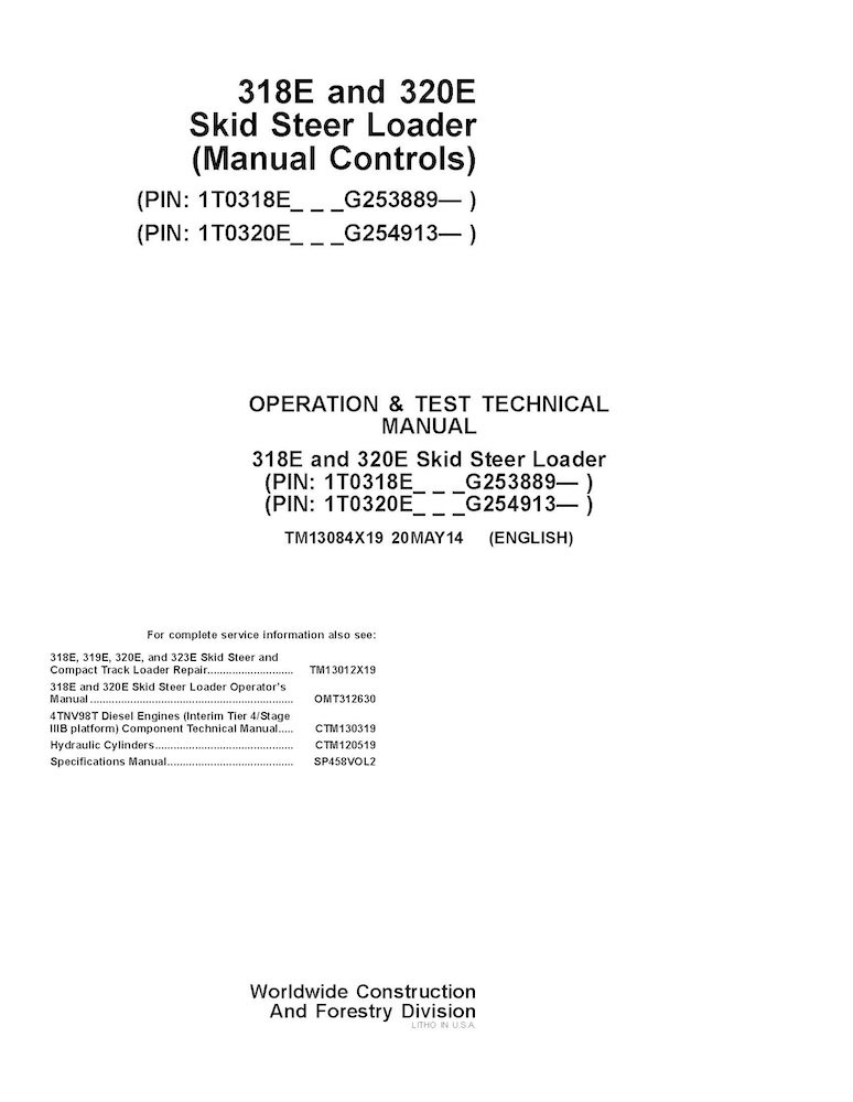 Carregadeira de direção deslizante John Deere 318E e 320E (Controles Manuais) PIN G253889 - manual técnico de operação e teste