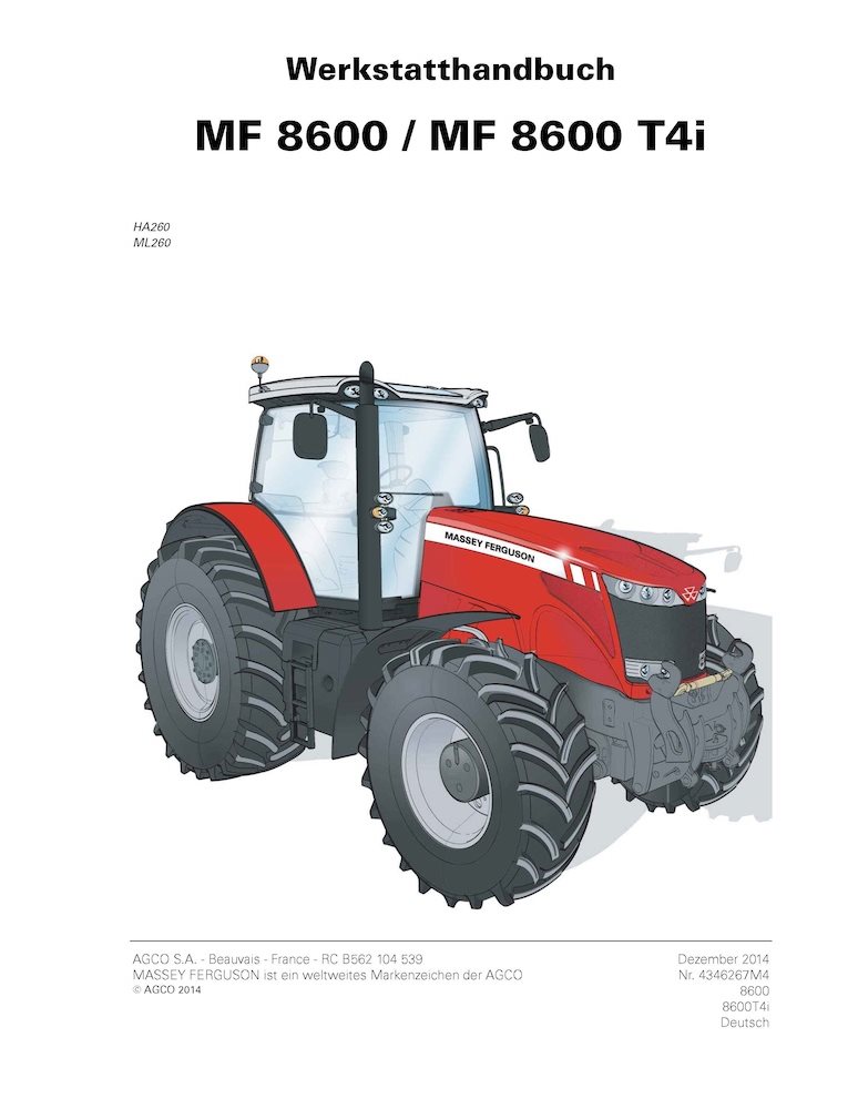 Manual de serviço de oficina em PDF para trator Massey Ferguson 8650, 8660, 8670, 8680, 8690 TIER 4i DE (4346267M4)